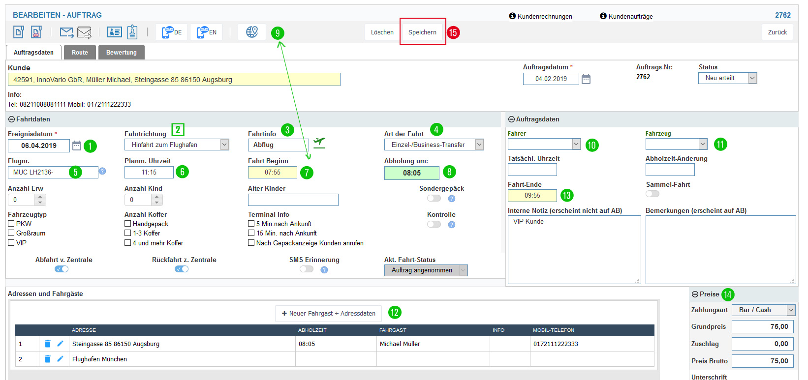 14. Geben Sie den Fahrpreis ein und wählen Sie aus wie der Kunde bezahlen soll. Diese Einstellungen werden auf alle Vorgänge des Auftrags automatisch übernommen.