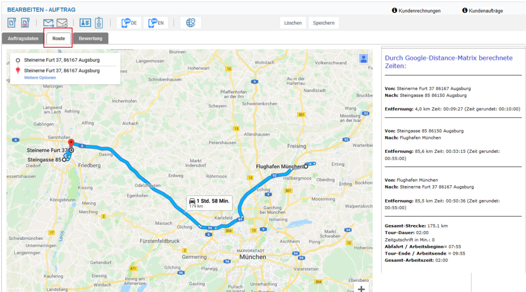 Sofern das Modul „Automatische Weg- und Fahrzeitberechnung“ dazugebucht wurde, die An- und Abfahrtszeiten automatisch berechnet und inklusive der Wegstrecken auf der Karte angezeigt.
