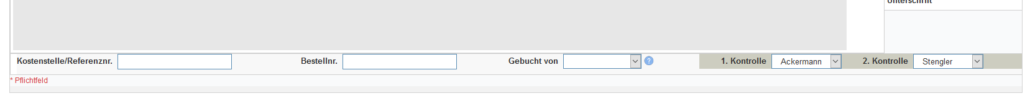 15. Prüfung des Auftrags durch einen weiteren Mitarbeiter. Im ersten Dropdown-Menü wird der Bearbeiter des Auftrags ausgewählt, im zweiten derjenige, der den Auftrag geprüft hat. Erst mit dieser Kontrolle ist der Auftrag verbindlich im System gebucht. (Sollten Sie nur einen Büroangestellten haben, kann ein und derselbe Name in beiden Feldern eingetragen werden)