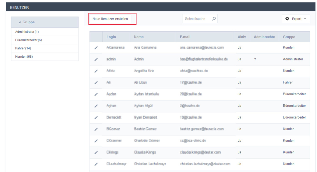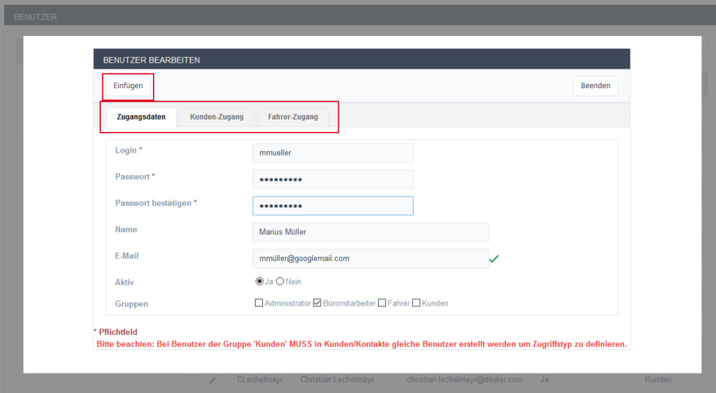 Benutzer können Büromitarbeiter, Fahrer oder Kunden sein (sofern das Modul: „Kundenzugang mit Rechte-Hirarchie“ gebucht wurde)